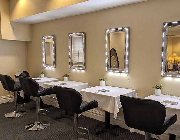 Our Blissful Bridal Lounge is available on your wedding day at no charge. It's available exclusively to you from 9am to 2pm, so you'll never be rushed. It's been thoughtfully designed with four hair and makeup stations, complete with professional lighting and mirrors to ensure you look your absolute best. Soft seating provides a cozy place for you and your bridal party to relax and enjoy those memorable moments leading up to your ceremony. To make your day even more special, we've included a dining area for a light meal or refreshments, ensuring you stay energized and hydrated. Plus, you'll have convenient access to restrooms ensuring your comfort and convenience are top priorities. Pittsburgh's Grand Hall is committed to making your wedding day a memorable and stress-free experience, and our new wedding dressing and prep room is just one more way we're here to support you.