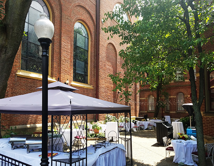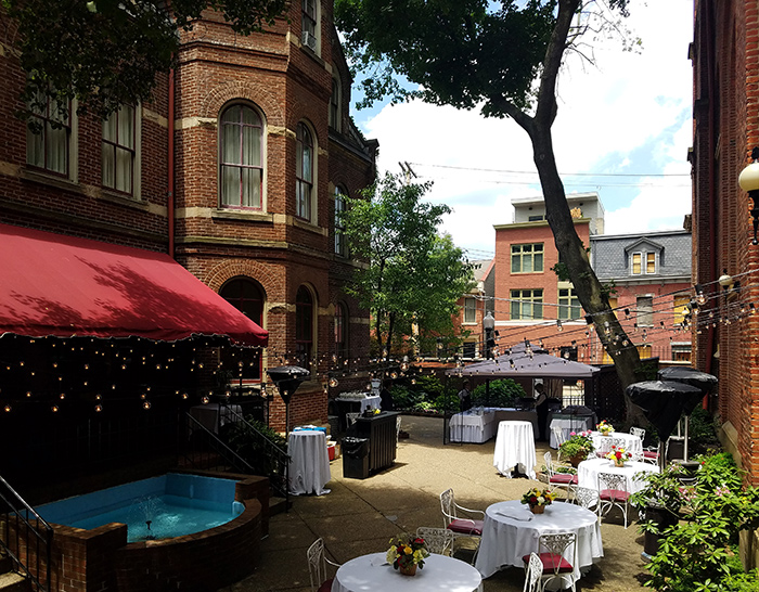 The Priory courtyard often serves also as the primary space for corporate events, happy hours, rehearsal dinners and the Priory Hotel's reknowned Third Thursday Wine Tasting.