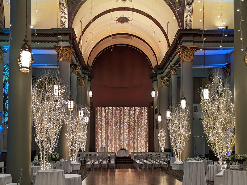 With our Winter Lights Snowflake Soiree Package, we will transport you and your guests into a realm of wonder. The hall will be adorned with tasteful and luxurious decor, incorporating the crisp white colors theme of the winter season and creating a warm and inviting atmosphere.